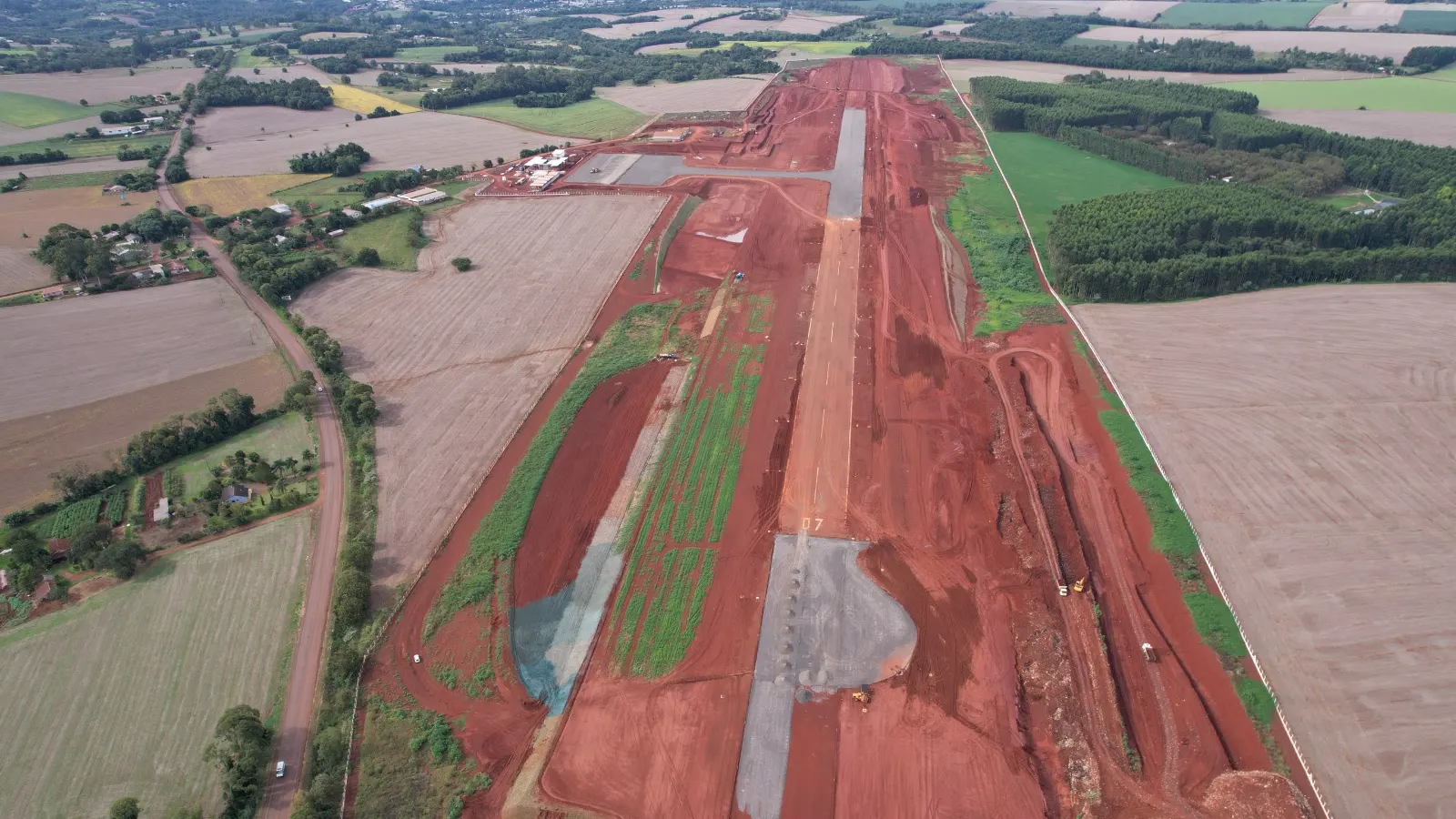A construção da pista, considerada a etapa mais complexa do projeto, atingiu 50% de execução. Os serviços de terraplanagem estão em fase final, enquanto a pavimentação asfáltica já foi iniciada em uma das extremidades, com previsão de suportar aeronaves de maior porte.